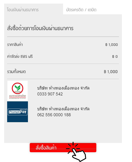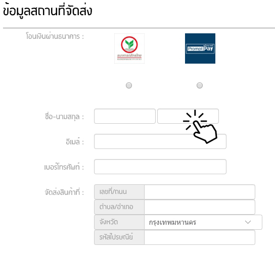เมื่อเลือกซื้อสินค้าเสร็จแล้ว ให้กดปุ่ม สั่งซื้อสินค้า เพื่อไปหน้ากรอกข้อมูลเตรียมการชำระเงิน สินค้าทั้งหมดใน list ของตะกร้าสินค้าจะเข้ามาในระบบ โดยระบบจะส่งไปยังหน้ากรอกที่อยู่จัดส่ง ระบบจะแสดงค่าสินค้า และ ค่าส่ง พร้อมค่าธรรมเนียมการชำระเงิน ในกรณีเลือกชำระด้วยบัตรเครดิต / เดบิต